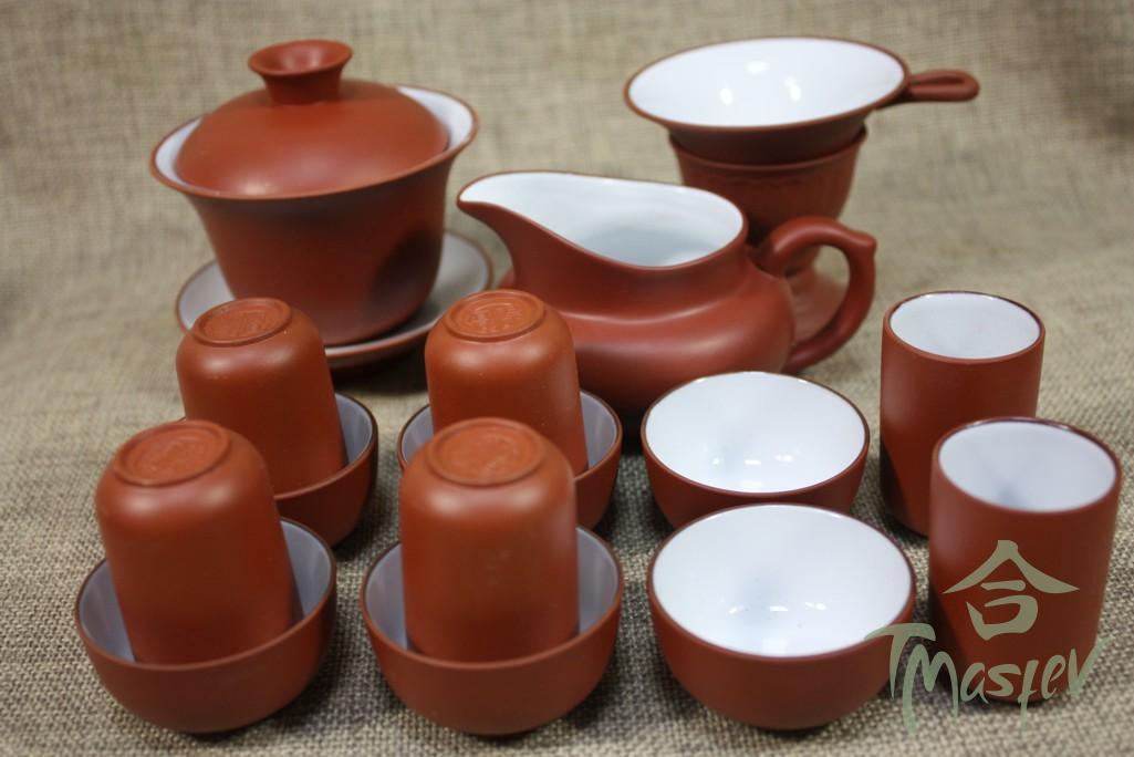 Набор для чаепития на 6 персон из фарфора. В набор входят: чайник, чаша для чая, колба для заваривания чая, баночка для хранения чая, гайвань, кружка для заваривания чая, сито, мирная чаша, 6 пиал, чаша для ополаскивания пиал, полотенце и щипцы.