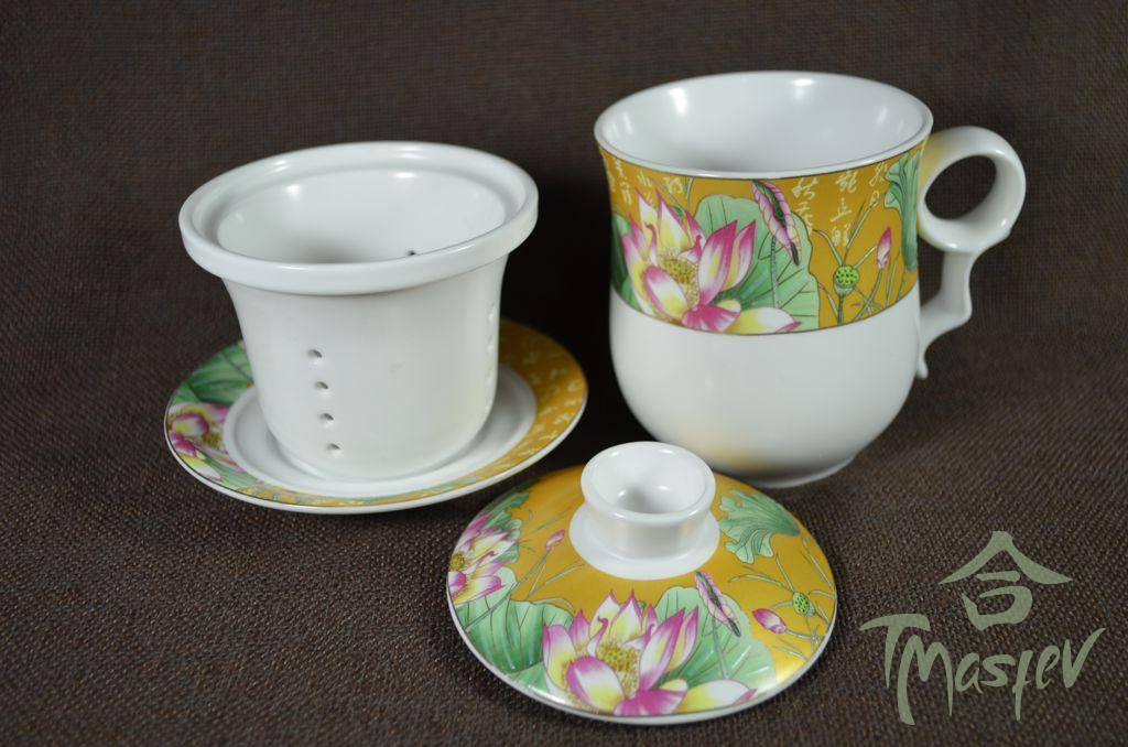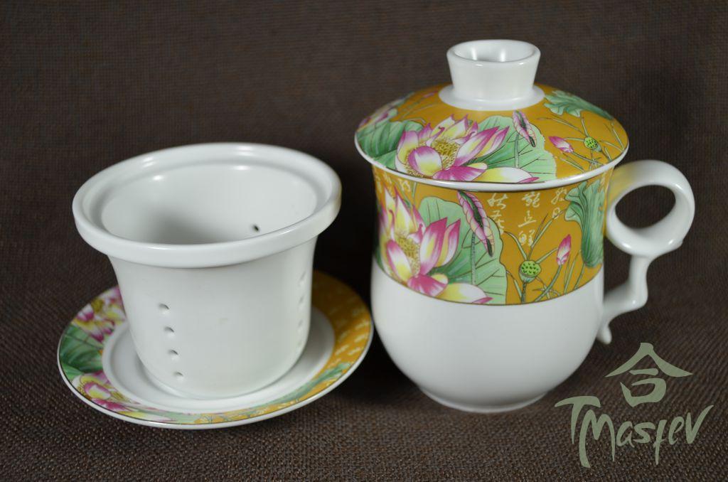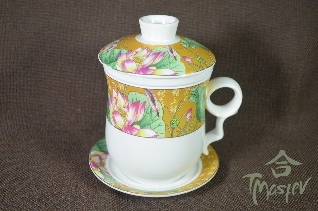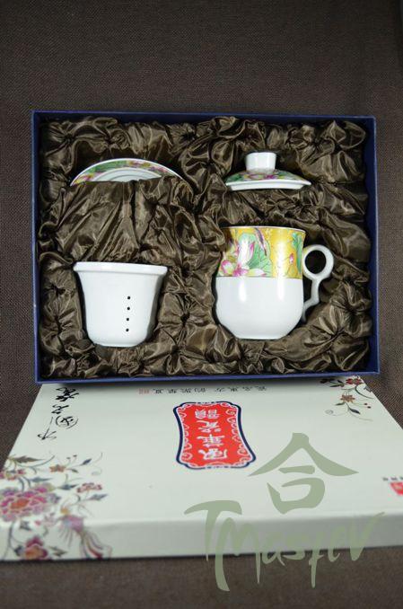Набор для чаепития на 6 персон из фарфора. В набор входят: чайник, чаша для чая, колба для заваривания чая, баночка для хранения чая, гайвань, кружка для заваривания чая, сито, мирная чаша, 6 пиал, чаша для ополаскивания пиал, полотенце и щипцы.