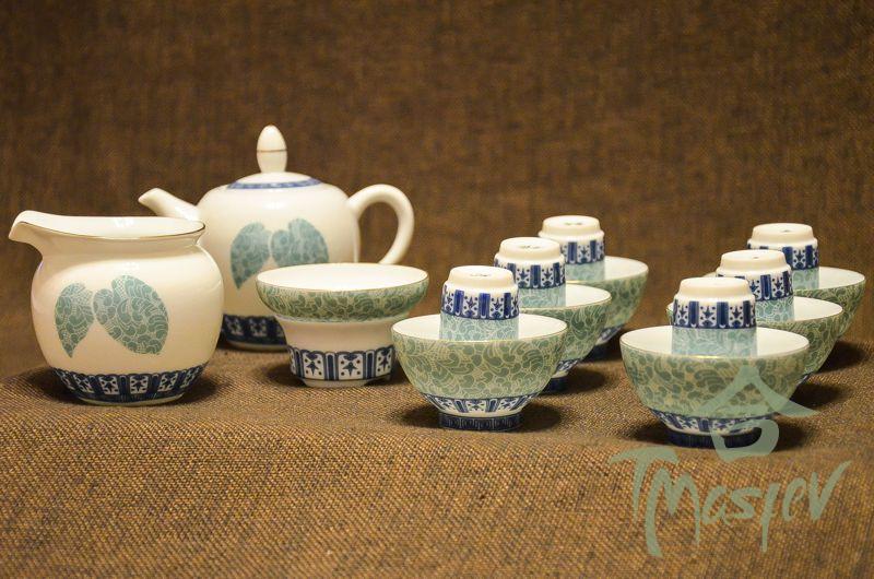 Набор для чаепития на 6 персон из фарфора. В набор входят: чайник, чаша для чая, колба для заваривания чая, баночка для хранения чая, гайвань, кружка для заваривания чая, сито, мирная чаша, 6 пиал, чаша для ополаскивания пиал, полотенце и щипцы.