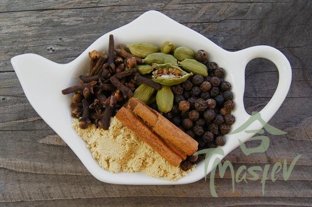 На 250 мл воды возьмите 4 шт кардамона, 2 горошины черного перца, 3 гвоздики, 1 кружок (2 мм толщина) имбиря и корицу на кончике ножа. Все ингредиенты необходимо размельчить в кофемолке, пересыпать в чашу с горячей водой и перемешать. Необходимо поставить чашу на огонь и томить все ингредиенты на слабом огне 10 минут. Далее дабавить 1 чайную ложечку черного классического чая и ложечку меда и выключить огонь.