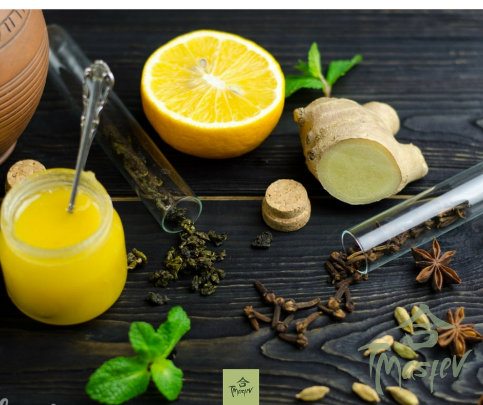 Корень имбиря нарезать тонкими кольцами. Залить имбирь отдельно в стакан с горячей водой 250 мл, и дать настояться 5 минут. Всыпать бирюзовый чай «Тегуанинь» в сито. Опустить сито в чайник и залить водой 250 мл. Температура воды при заварке чайного листа должна быть не более 90 градусов. Через 30 секунд вынуть сито с чайным листом. Добавить в чайник с чаем имбирь, бадьян, гвоздику, настой с имбирем. Ждем еще 5 минут, и добавляем в чай лайм и мяту.